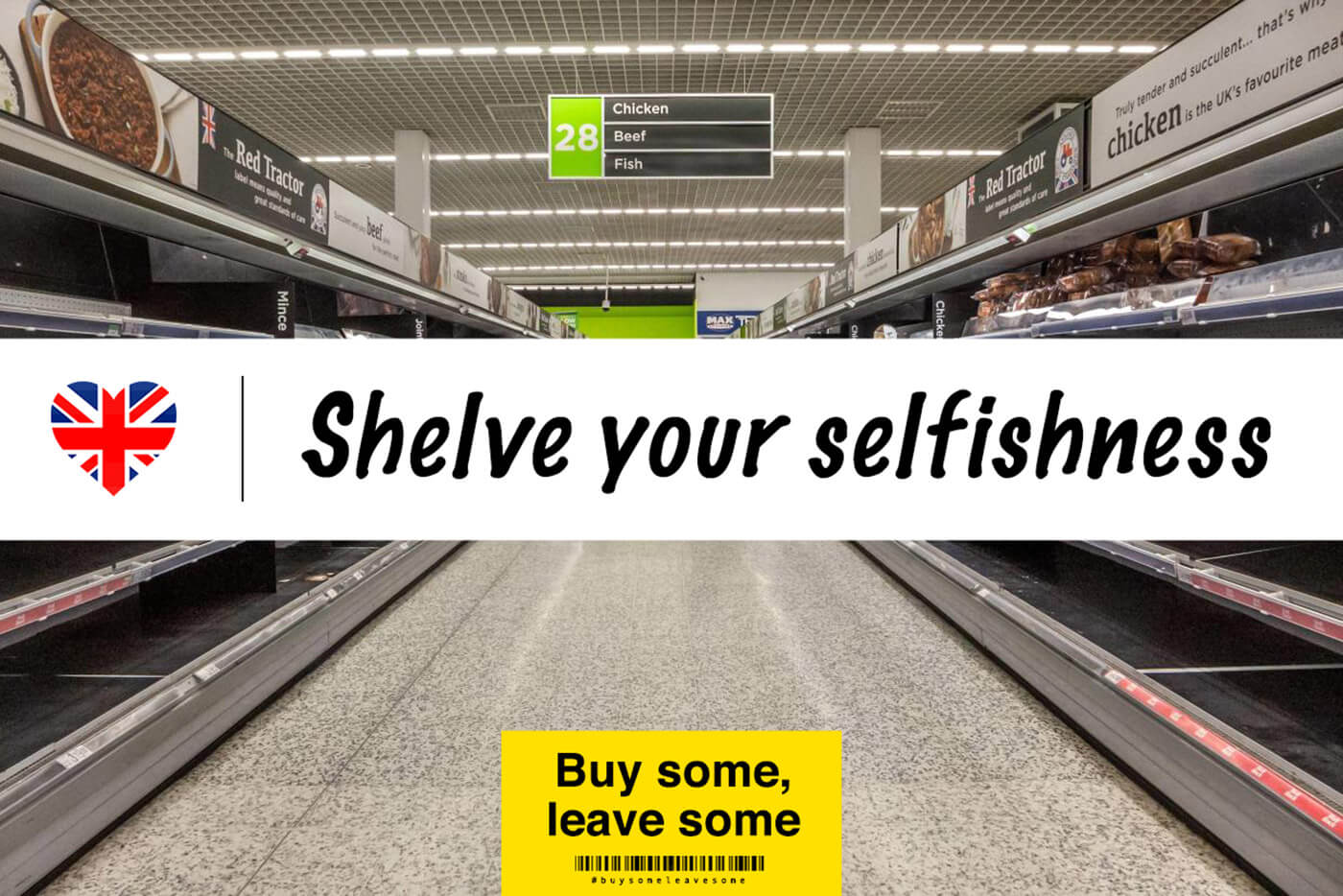Responding to a need, highlighted by the Labour Party to assist in persuading consumers not to panic-buy, ‘Buy Some, Leave Some, was an attempt to help steer collective opinion by using a friendly visual language that is very familiar to supermarket shoppers, particularly those who are regularly on the look out for bulk-buying deals. As well as the ads we made up some stickers to flyer local supermarkets as a gentle reminder to be considerate to others.