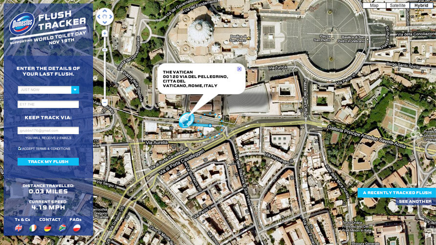 Flushtracker was a site which allowed people to enter their postcode and the time of their last flush. Using Google maps and treatment plant information, it tracked their flush’s route from toilet to treatment plant – a stark contrast to the 40% of the world’s population without sanitation facilities.