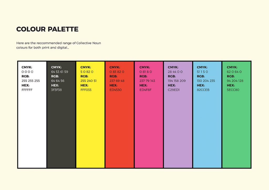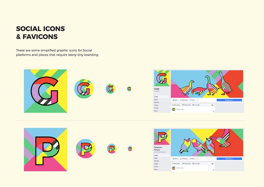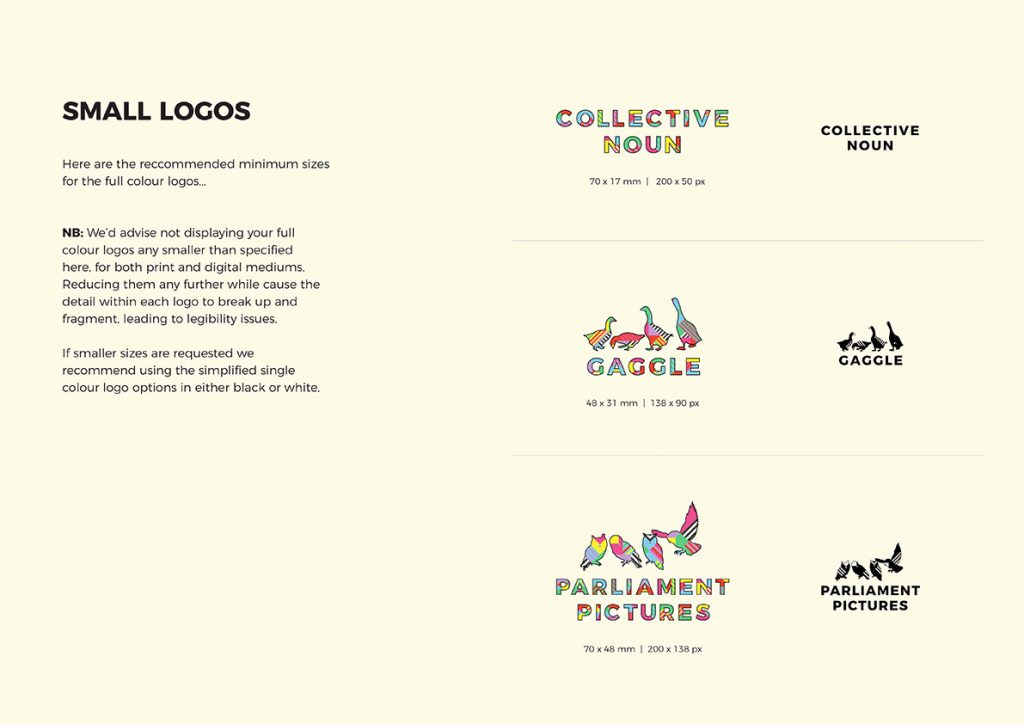 A toolkit of branding for TV production agency Gaggle, which included logos and marks for their holding company Collective Noun and their film production company Parliament. All the imagery was based around collective nouns of animals; a gaggle of geese and a parliament of owls. The geometric patterns and bright colour scheme have taken inspiration from artist Yinka Ilori giving a playful and contemporary aesthetic to this piece of branding.