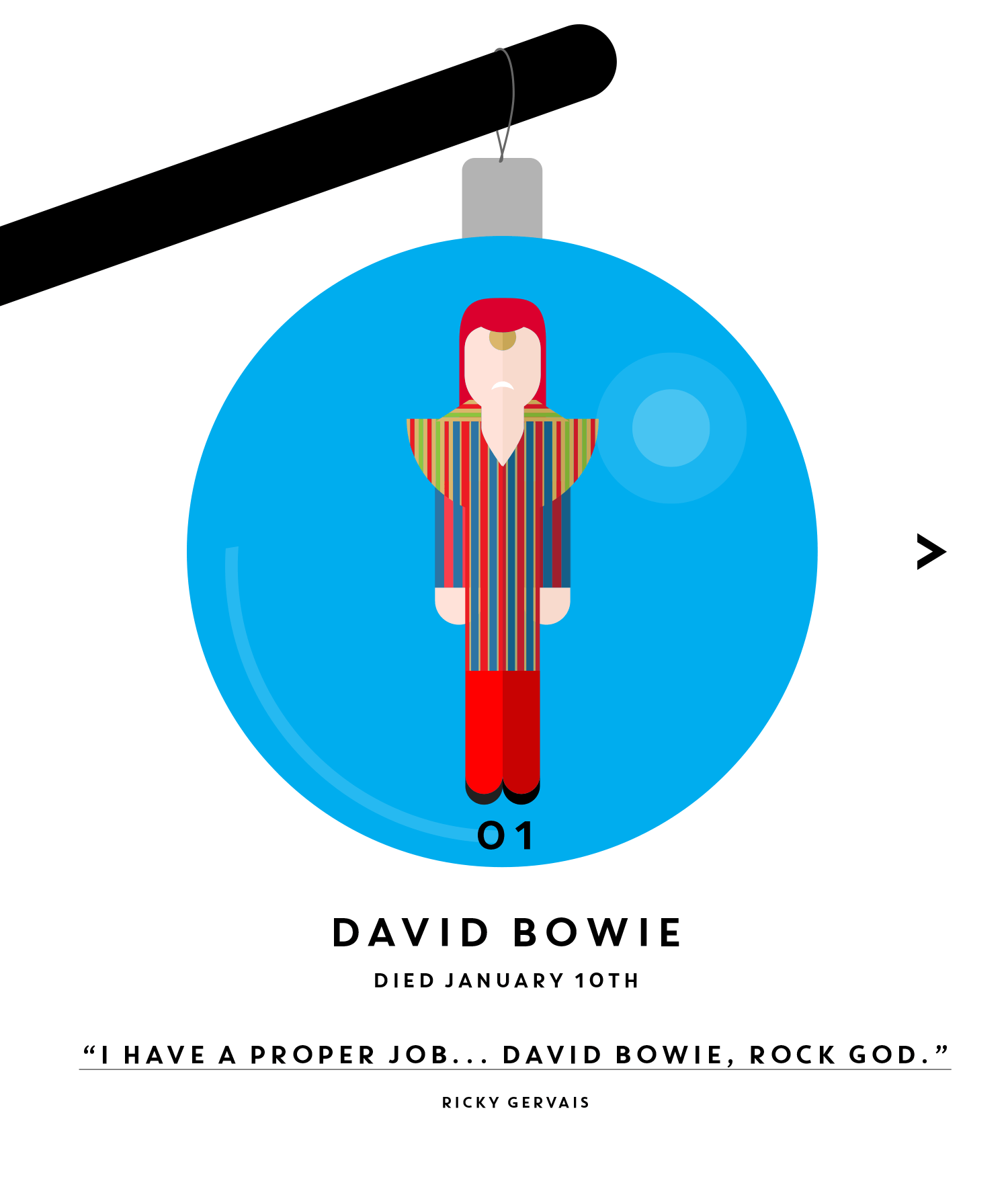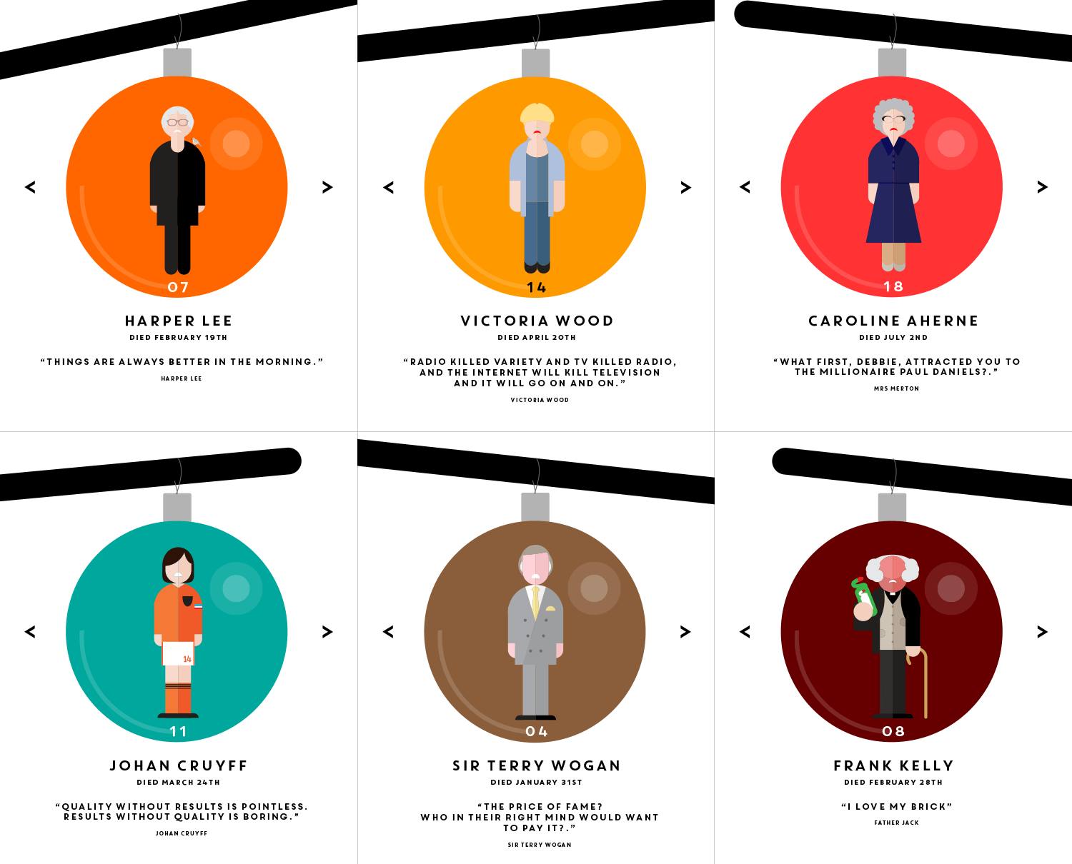 So helped Make It Red create something a little different. And with such a significant number of first, second and third generation pop icons dying out in 2016 it seemed the perfect opportunity to commemorate these legends with our own festive homage. Morbid Baubles was a dead Christmas tree advent calendar shrine. We directed the public to pay their daily respects during December via teaser posts on Facebook, Twitter and Instagram. The website was accompanied by a limited edition 2017 calendar print highlighting the celebrities’ 1st anniversary death dates. These were sent out to our most treasured clients.